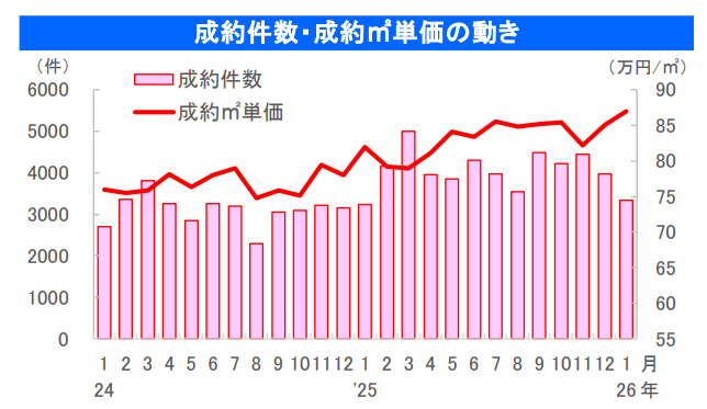 レインズが公表している2026年1月度の「月例マーケットウォッチ」を確認すると、東京都と周辺エリアでは、中古マンションの成約件数や価格水準に違いが見られます。