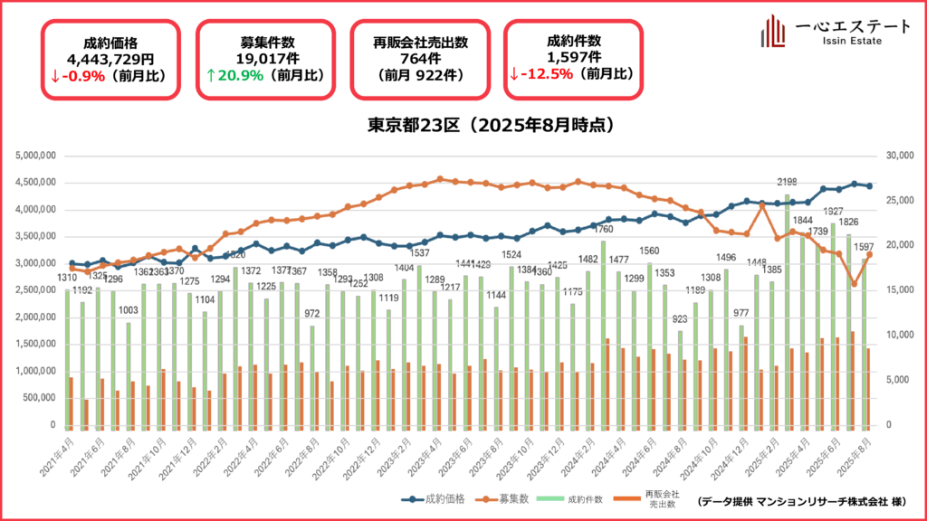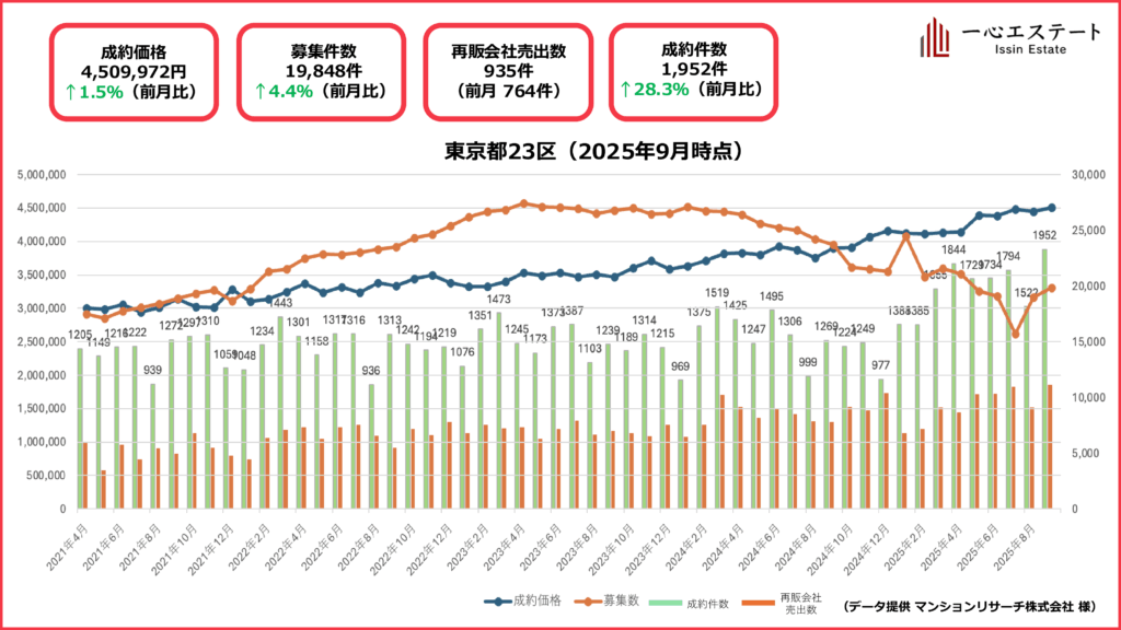 平均坪単価450万円(前月比+1.5%)と上昇。成約件数は1,952件(+28%)と過去最高を更新し、募集件数も19,848件(+4.4%)と増加しました。再販会社の売り出しは935件(8月:764件)と大きく伸び、繁忙期入りに向けて供給側の動きも本格化しています。