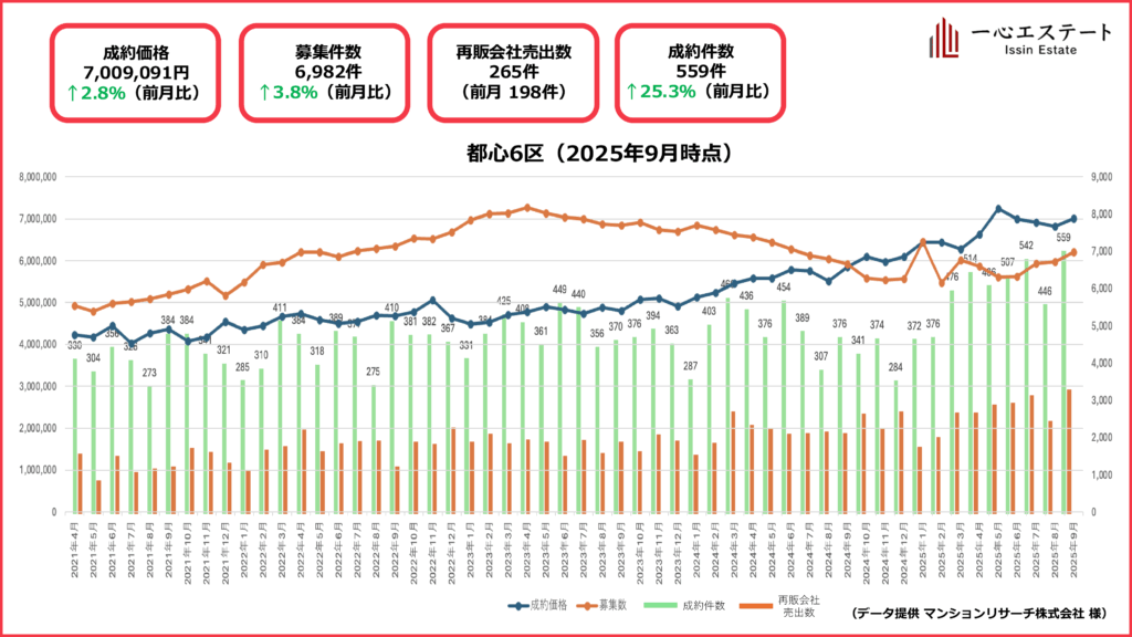 9月の都心6区は、平均坪単価700万円(前月比+2.8%)と上昇。成約件数は559件(+25%)と大幅増、募集件数も6,682件(+3.8%)と拡大しました。再販会社の売り出しも265件(8月:198件)と急増し、供給・需要の両面が活発化しています。