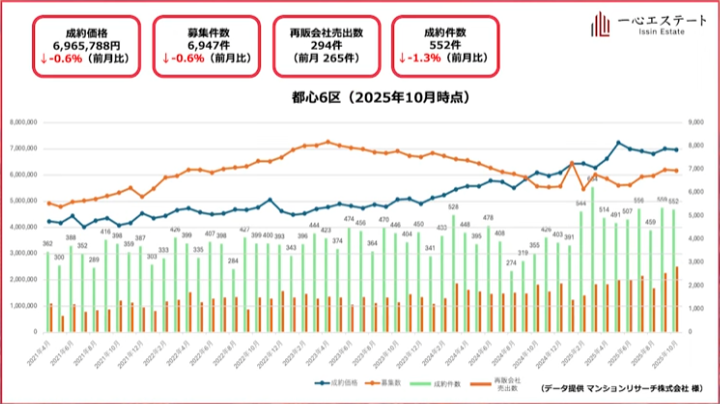 10月の都心6区は、平均坪単価696万円(前月比-0.6%)と減少。成約件数は552件(-1.3%)と減少、募集件数も6,947件(-0.6%)と全体的に減少しています。