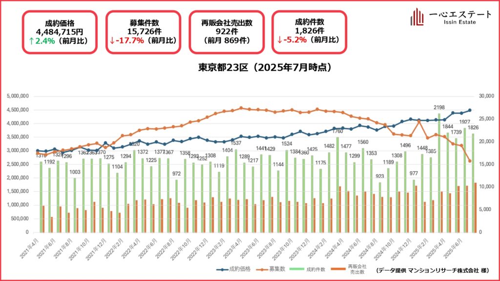 7月の23区マンション市場は、平均坪単価448万円(前月比+2.4%)と上昇。一方で、成約件数は1,826件(-5.2%)と調整し、在庫(募集件数)は15,700件(-17.7%)と大きく減少しました。
