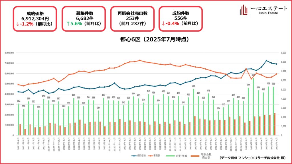 7月の都心6区は、平均坪単価691万円(前月比ほぼ横ばい)で推移しました。成約件数は556件(-0.4%)と実質横ばいながら、募集件数は6,682件(+5.6%)と23区全体とは逆に在庫が回復。再販会社の売り出し数も253件(6月:237件)と増加しました。