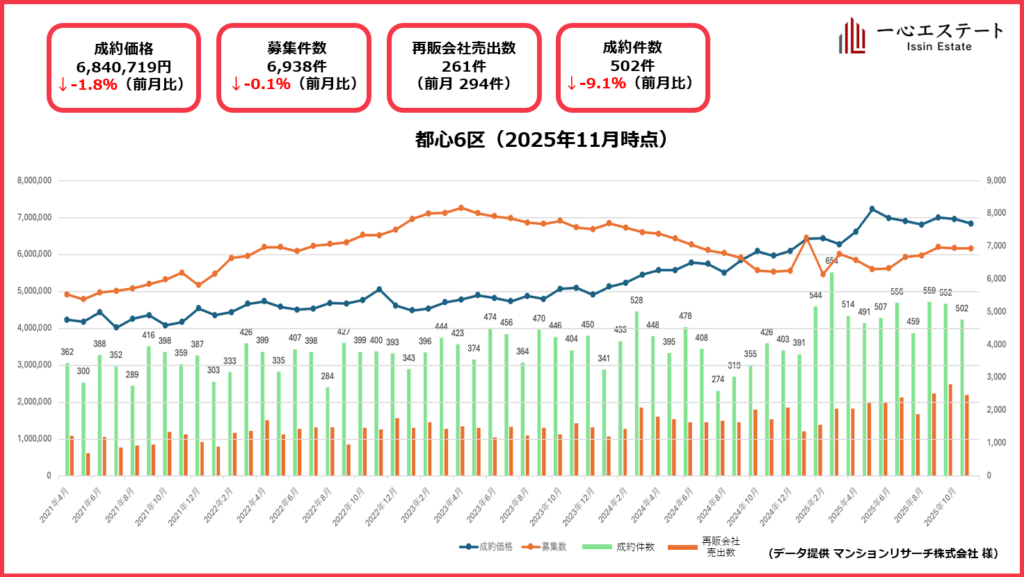 23区全体と比較しても、都心6区(千代田・中央・港・新宿・渋谷・文京)の落ち込みはさらに深刻な数字が出ています。特に成約件数が -9.1% と大きく落ち込んでおり、市場の冷え込みが顕著です。これは都心の物件価格が高騰しすぎたことで、購入検討層が「買い切れない」状態になっていることを示しています。
