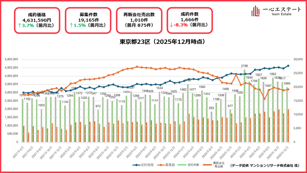 平均坪単価463万円(前月比+3.7%)と増加。坪450万円を再び超えて、最高値を更新しました。成約件数は1,666件(-8.3%)減少していますが、募集件数は19,165件(+1.5%)と好調。再販会社の売り出しは1,010件(11月:875件)と大きく増加しています。